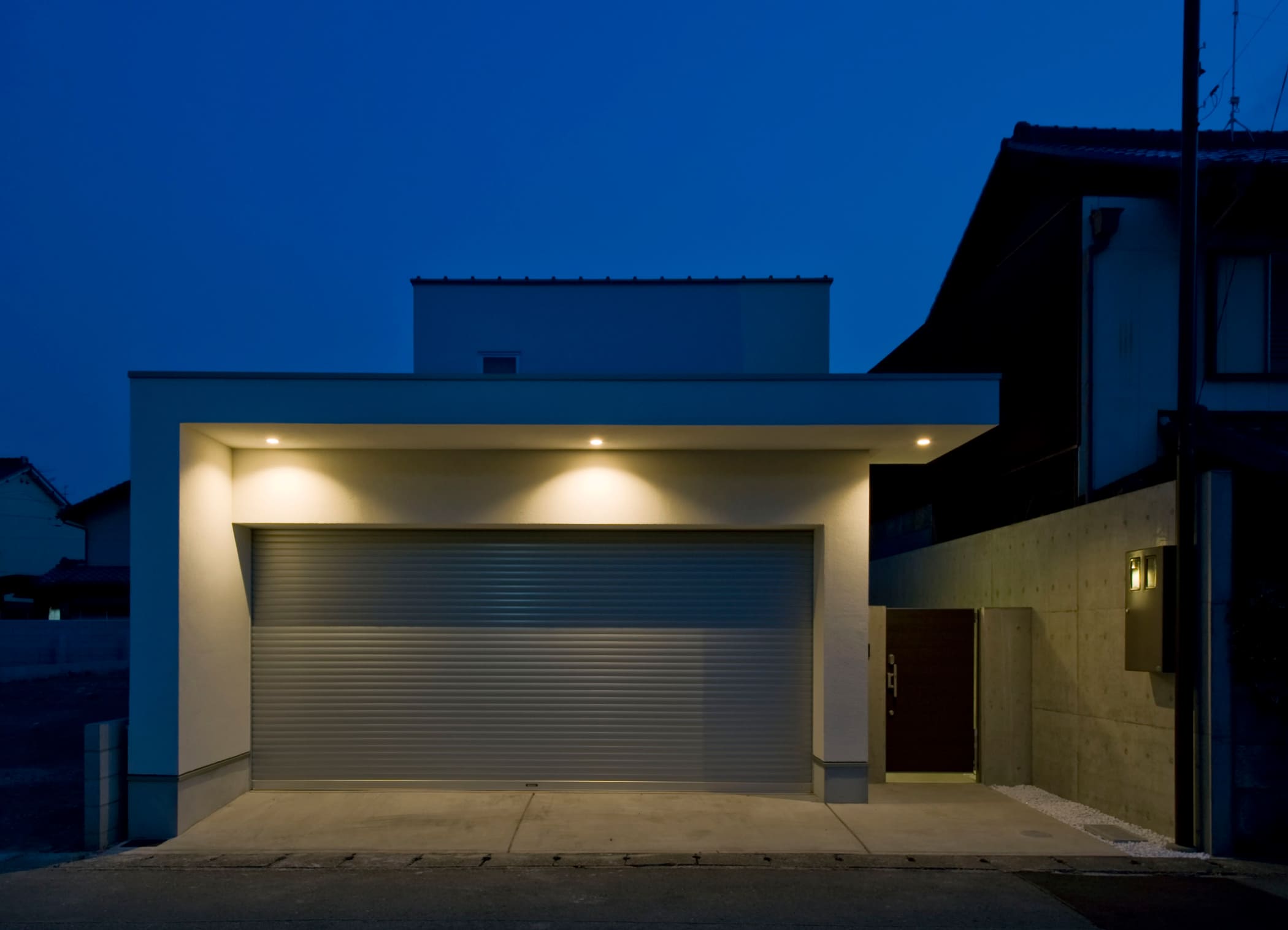 夜になれば、計算されたダウンライトがガレージを美しく照らし出し、まるでギャラリーのような佇まいで、ご家族の帰りをアートな光で迎えます。