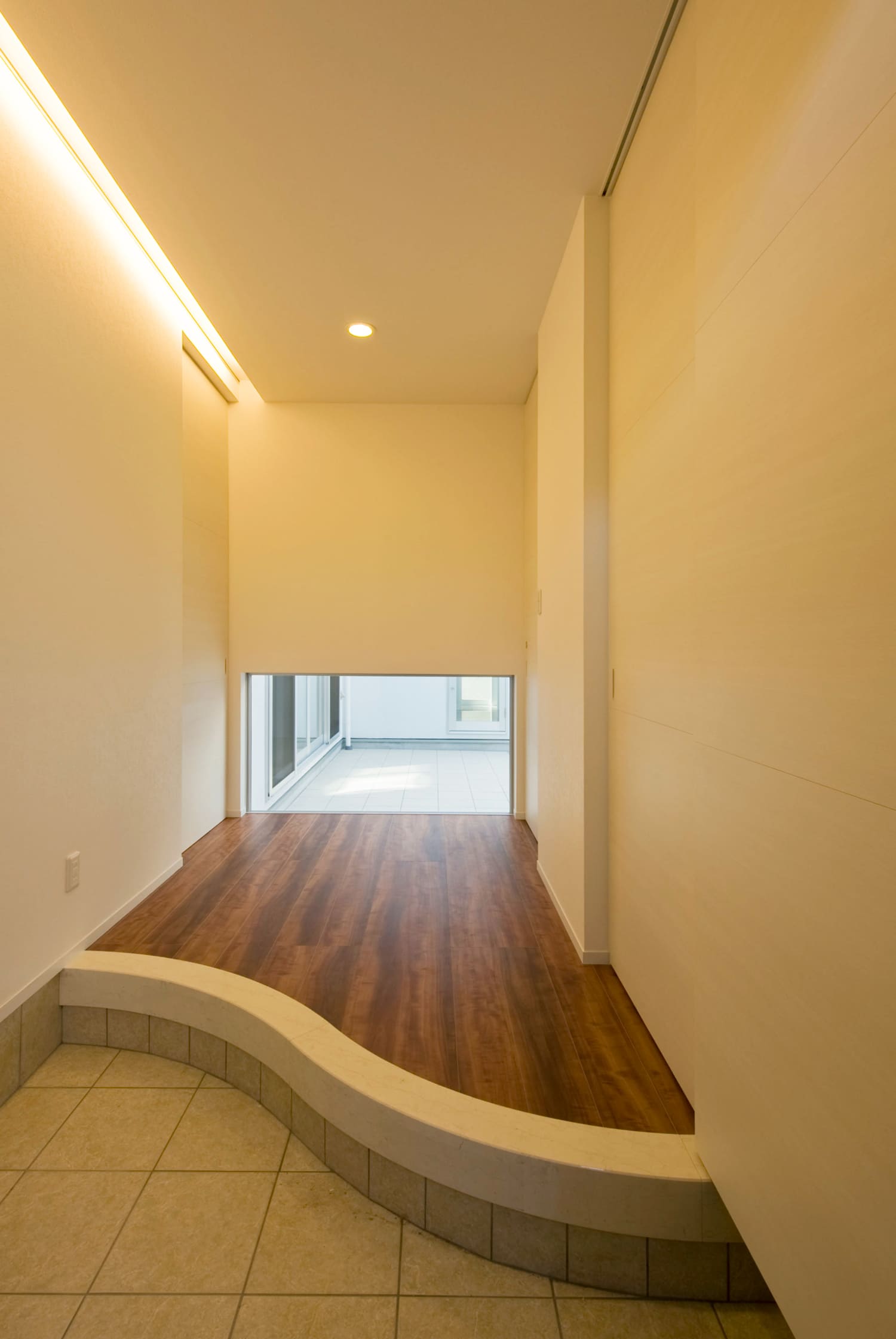 お客様や家族を迎え入れる玄関ホールは、柔らかな曲線を描く壁が、その先のLDK空間へと優しく誘います。