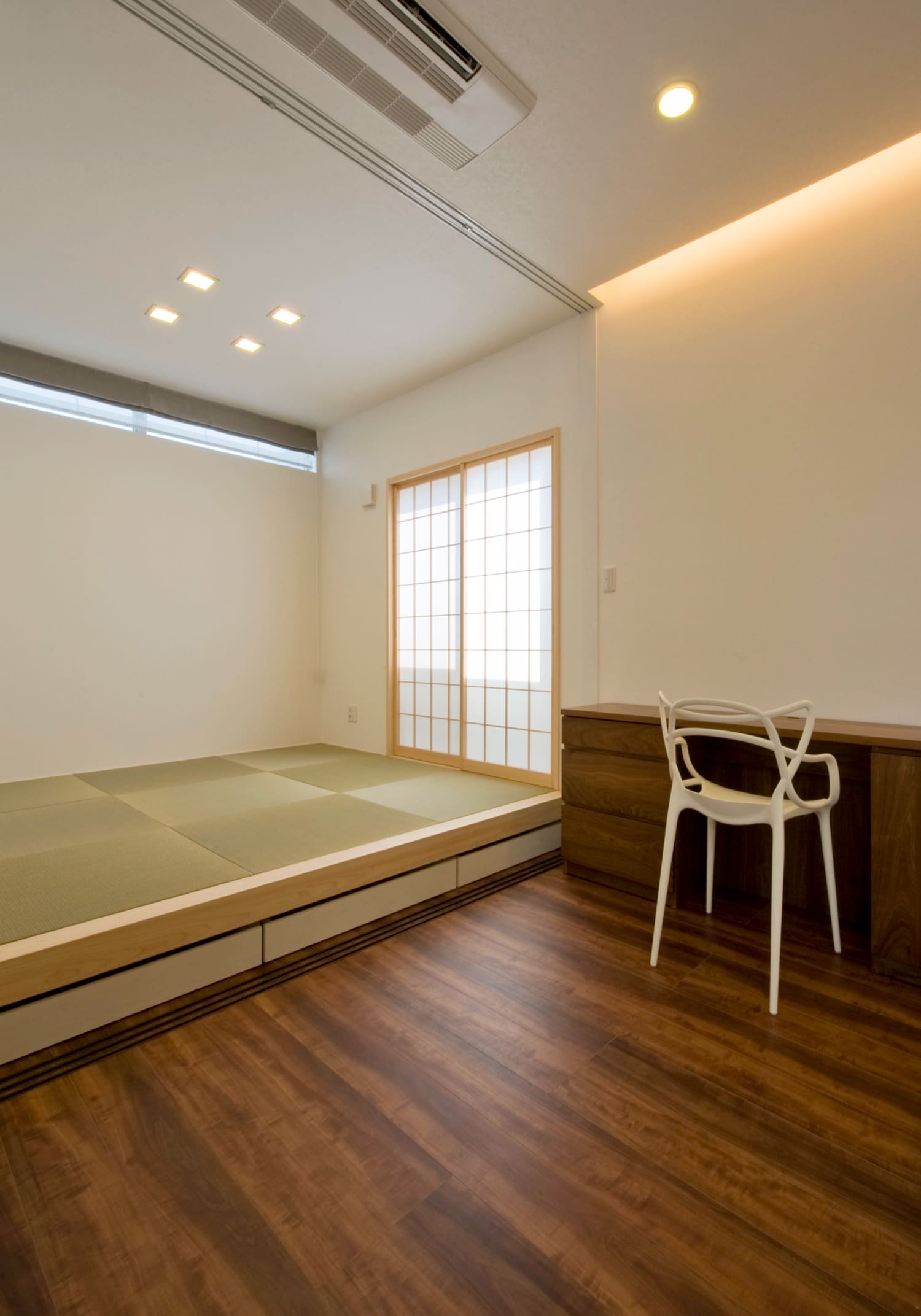 リビングの一角には、障子を思わせるスクリーンで仕切られた、モダンな「小上がり」の畳スペースを設けました。