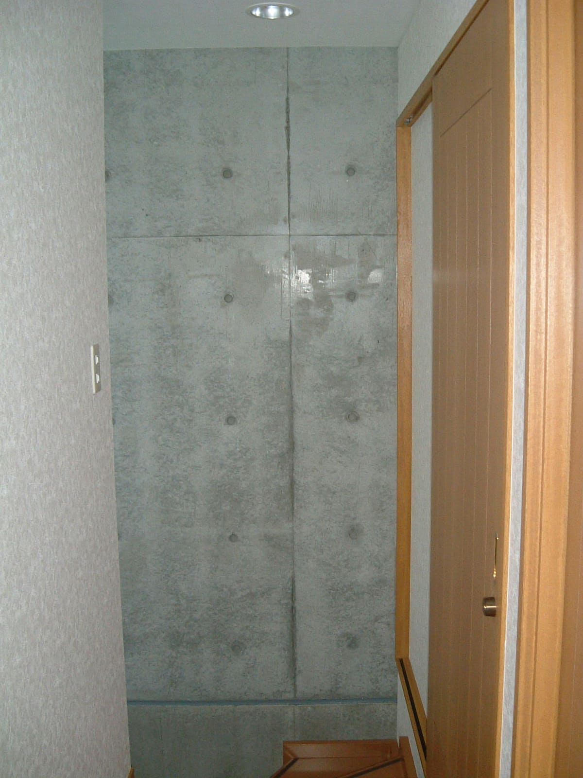 玄関の重厚な木の扉を開けると、コンクリートと木の床、そしてガラスが織りなす、光と影の美しい世界が広がります。